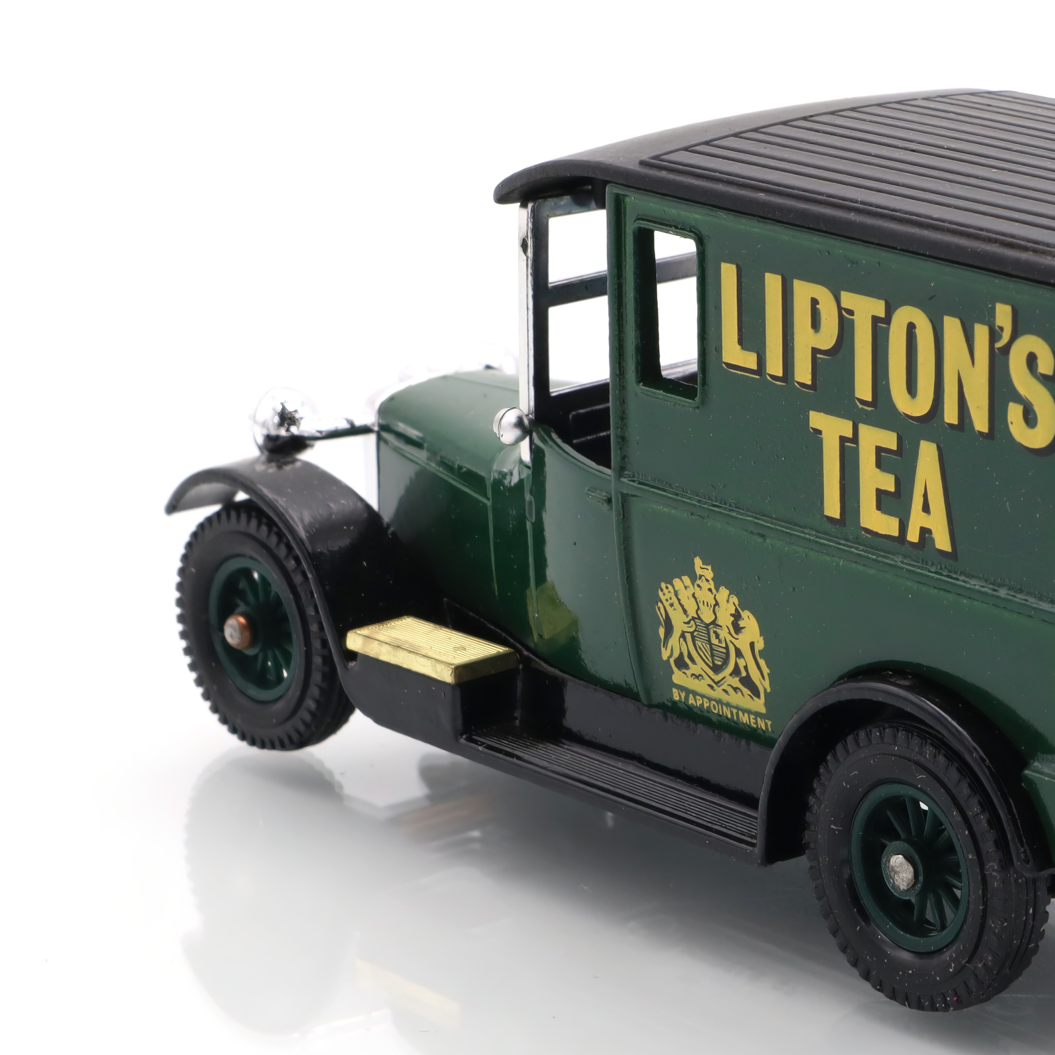 Das Modellauto wurde mit viel Liebe zum Detail gefertigt: Die tiefgrüne Lackierung, die typischen goldgelben „Lipton’s Tea“-Schriftzüge und das royale Emblem auf der Wagenflanke lassen das Herz jedes Miniatur-Fans höherschlagen. Die Frontpartie des Talbot ist klassisch geformt, mit liebevoll gestalteten Scheinwerfern in Chromoptik und detailreichen Speichenrädern, die an die Blütezeit der Lieferwagen der 1920er Jahre erinnern. Besonders attraktiv ist der starke Kontrast zwischen dunkelgrünem Korpus und den glänzenden Chromteilen an Kühlergrill und Scheinwerfern sowie die stimmigen Akzente wie die strukturierte Kastenfläche des Daches oder die filigranen Trittbretter.