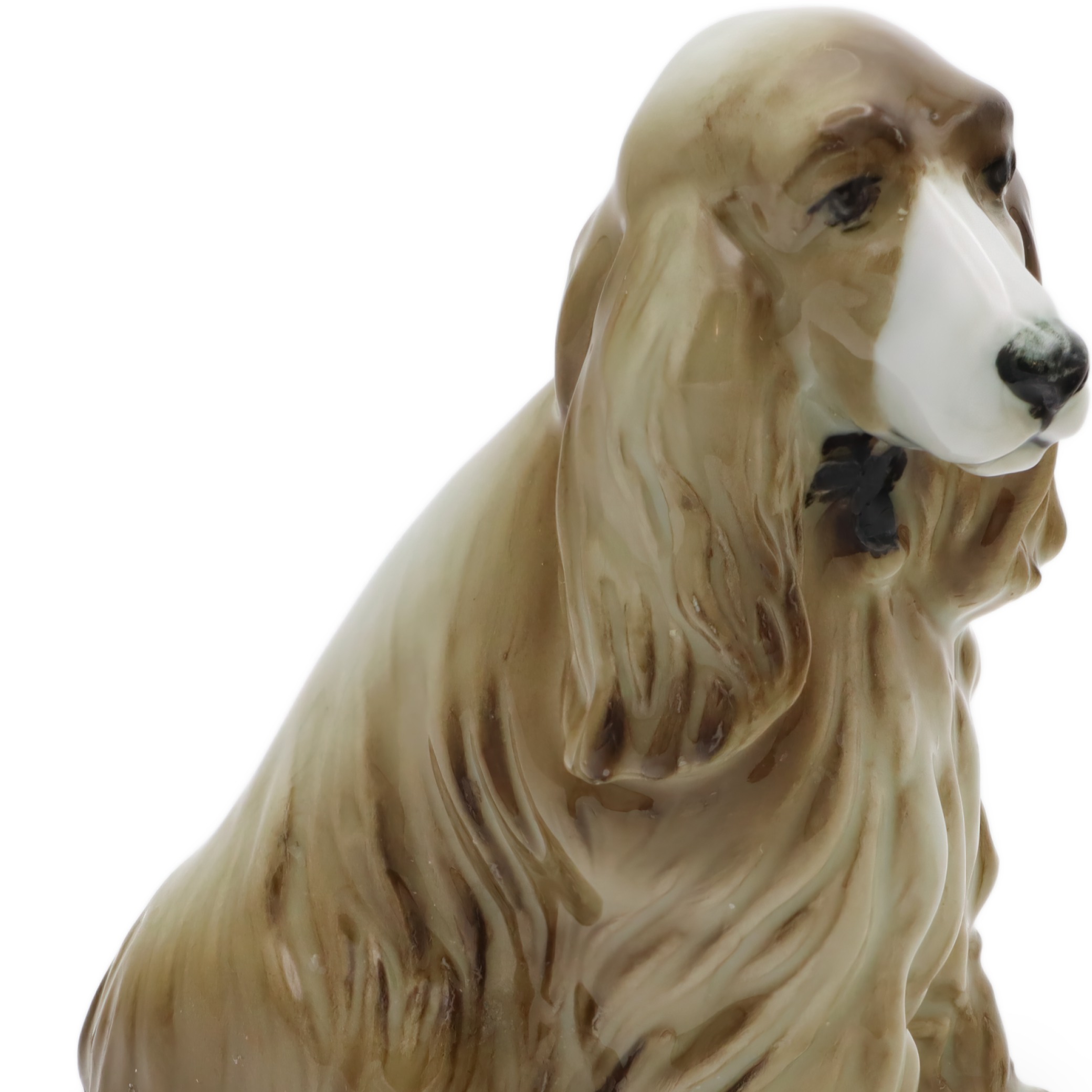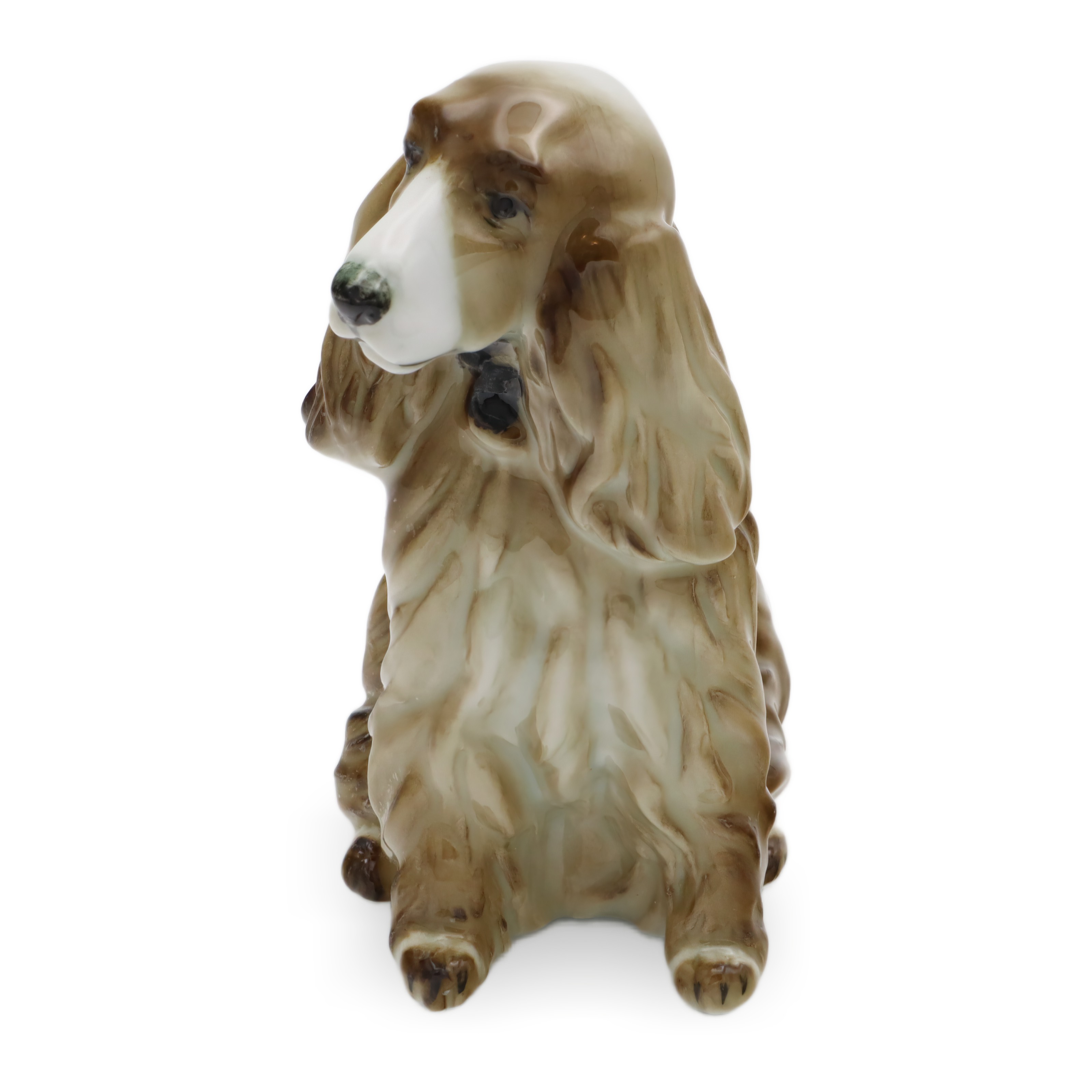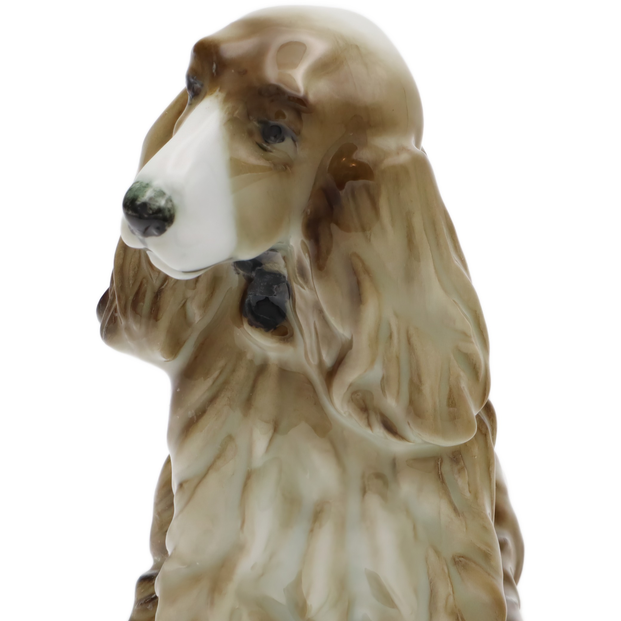Besonders auffällig ist das lebensechte Gesicht des Hundes. Die samtigen, leicht herabhängenden Ohren und die feine, sorgfältig glasierte Nasenspitze sorgen für eine extra Portion Realismus. Man kann beinahe spüren, wie weich sich das Fell anfühlen müsste – da zeigt sich die Handwerkskunst von Zsolnay. Rücken, Hinterbeine und auch der angedeutete Wedel sind mit liebevollen Details gestaltet, die den natürlichen Sitz und den Charakter eines Spaniels perfekt einfangen.