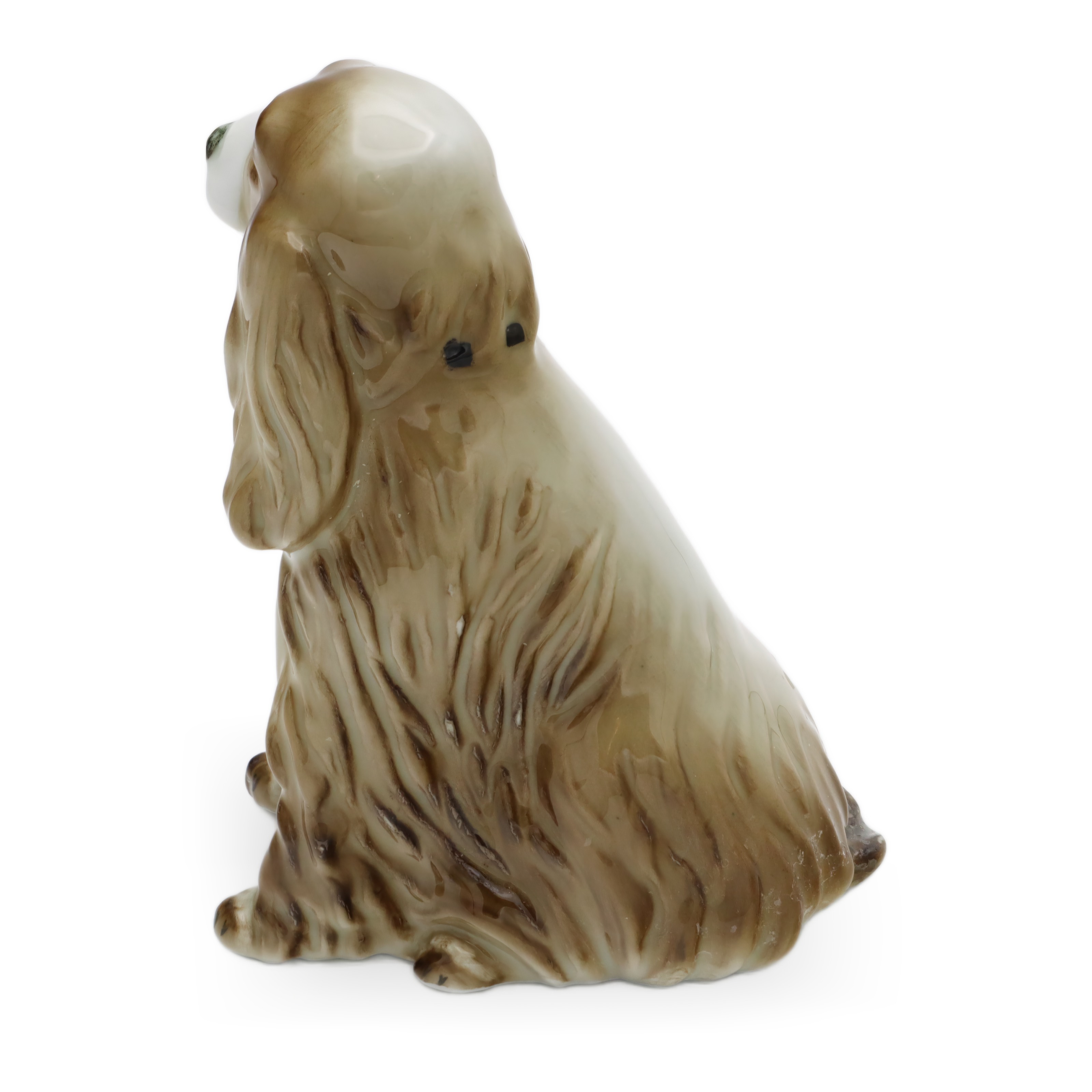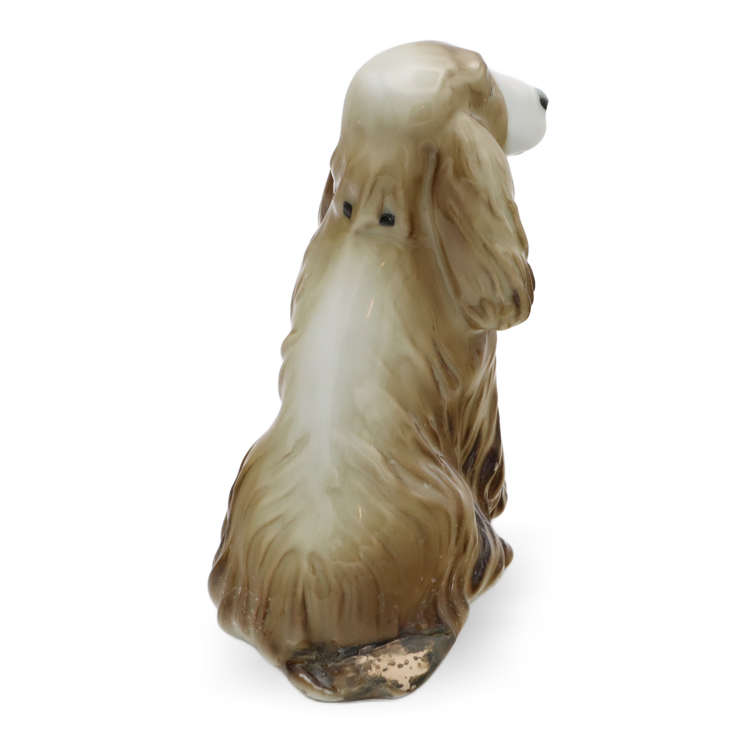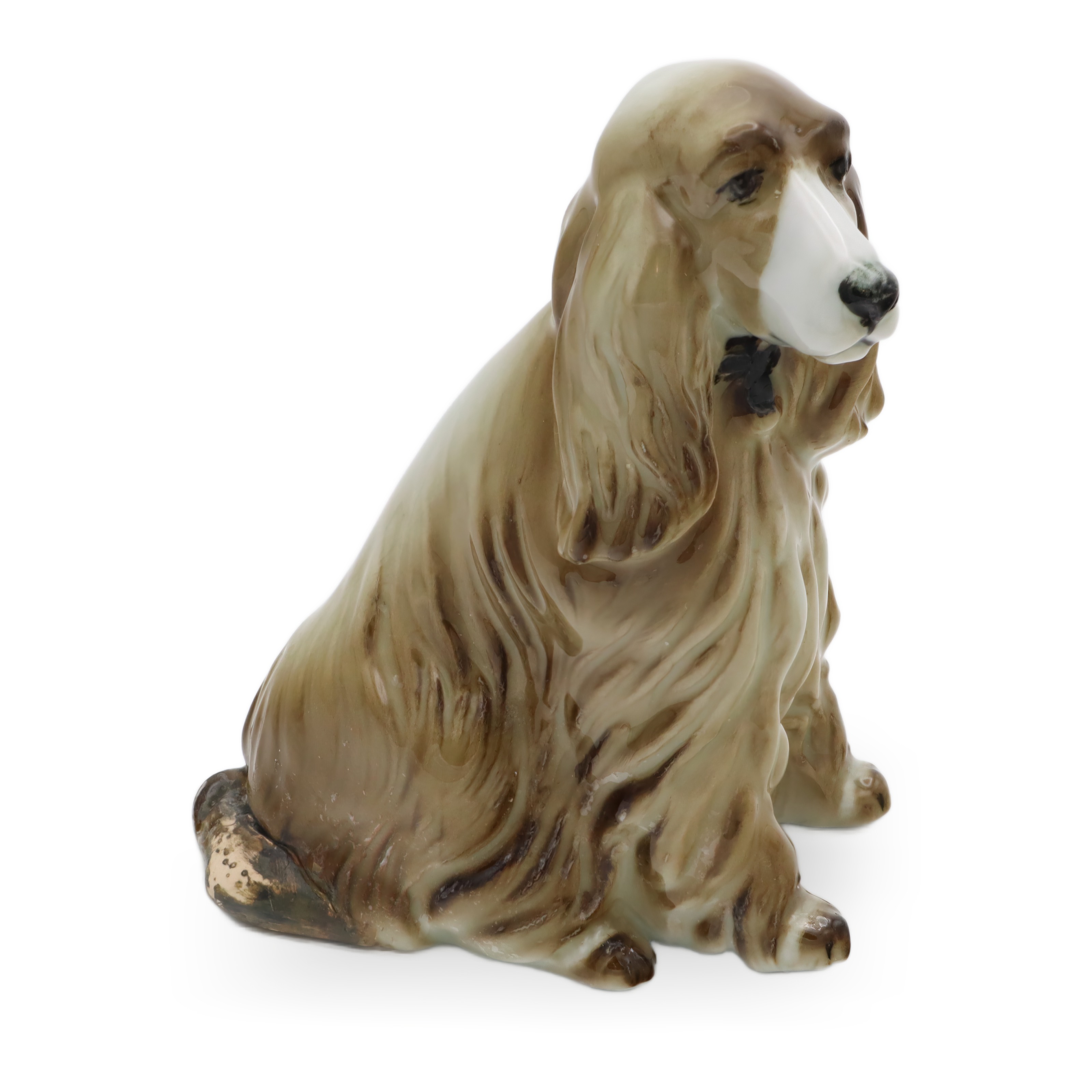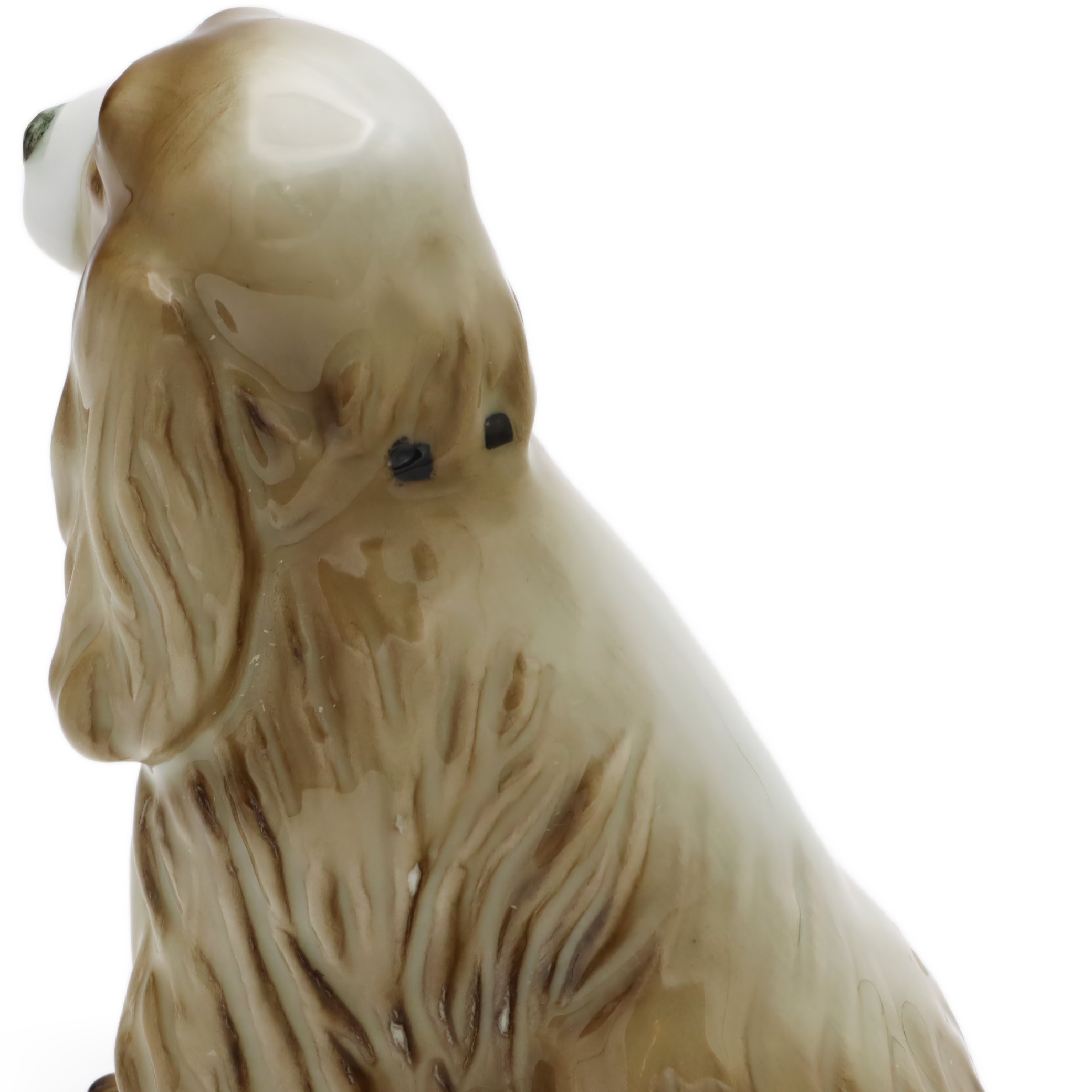 Besonders auffällig ist das lebensechte Gesicht des Hundes. Die samtigen, leicht herabhängenden Ohren und die feine, sorgfältig glasierte Nasenspitze sorgen für eine extra Portion Realismus. Man kann beinahe spüren, wie weich sich das Fell anfühlen müsste – da zeigt sich die Handwerkskunst von Zsolnay. Rücken, Hinterbeine und auch der angedeutete Wedel sind mit liebevollen Details gestaltet, die den natürlichen Sitz und den Charakter eines Spaniels perfekt einfangen.